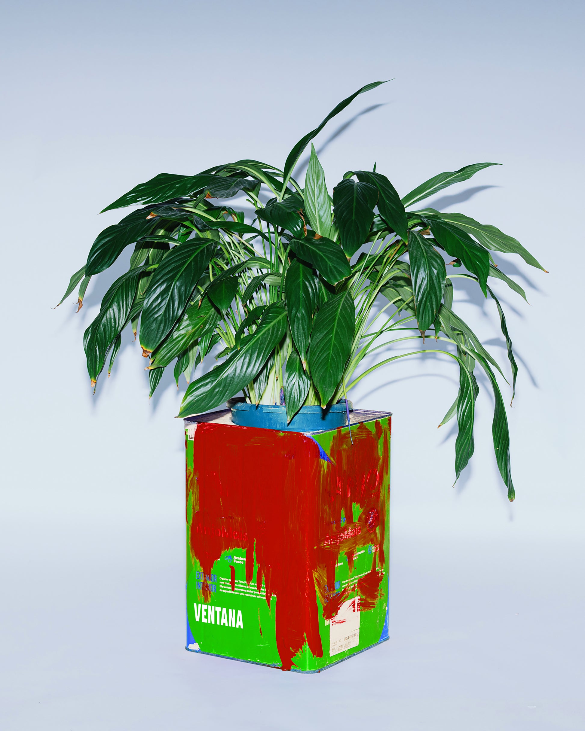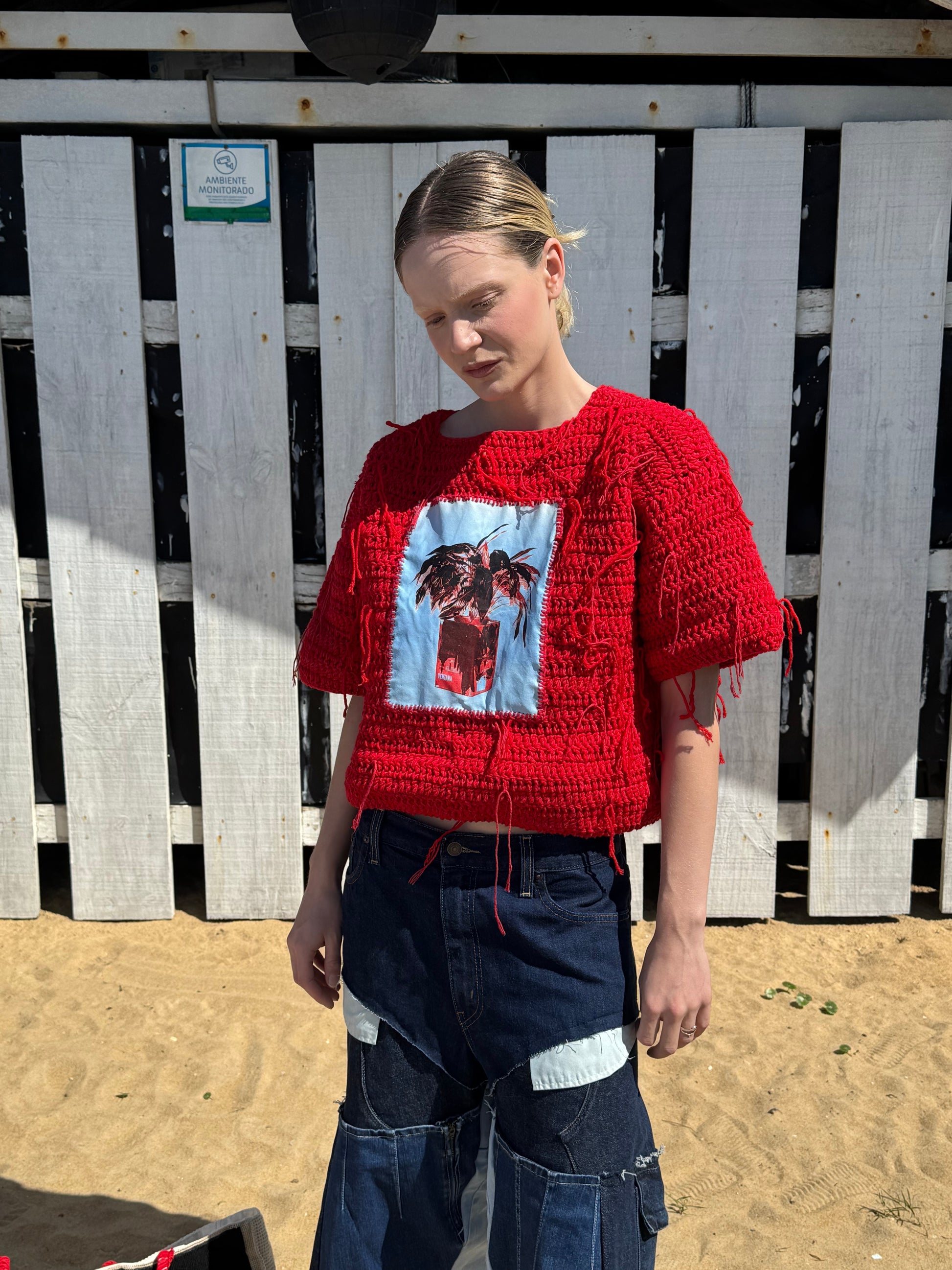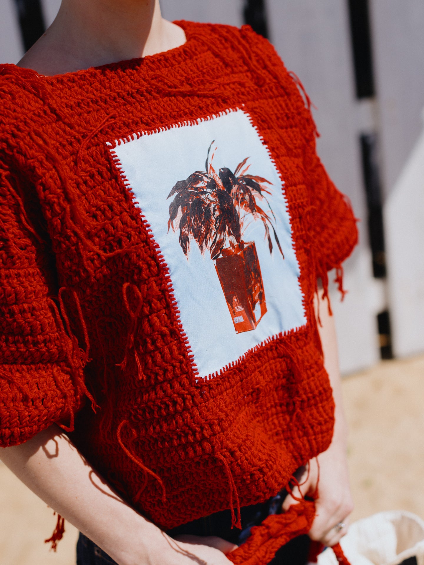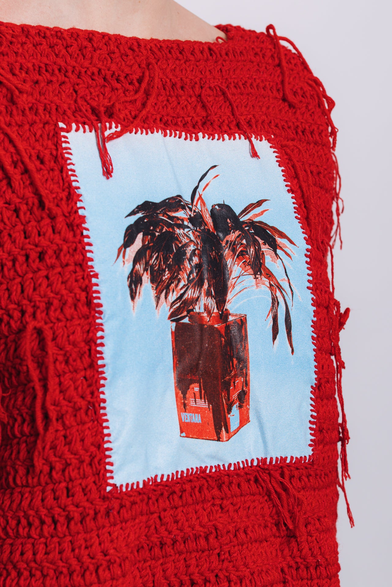 Blusa de crochê feita em referência a como avó da Anitta que improvisava latas de tinta como vasos de flor.