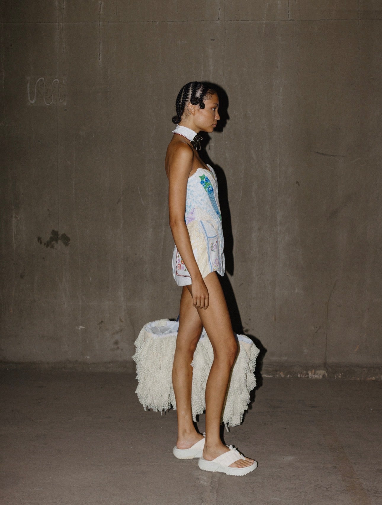 Peça feita a partir de toalhinhas vintages de cozinha. Peça com estrutra de barbatanas e ajustável nas costas.
