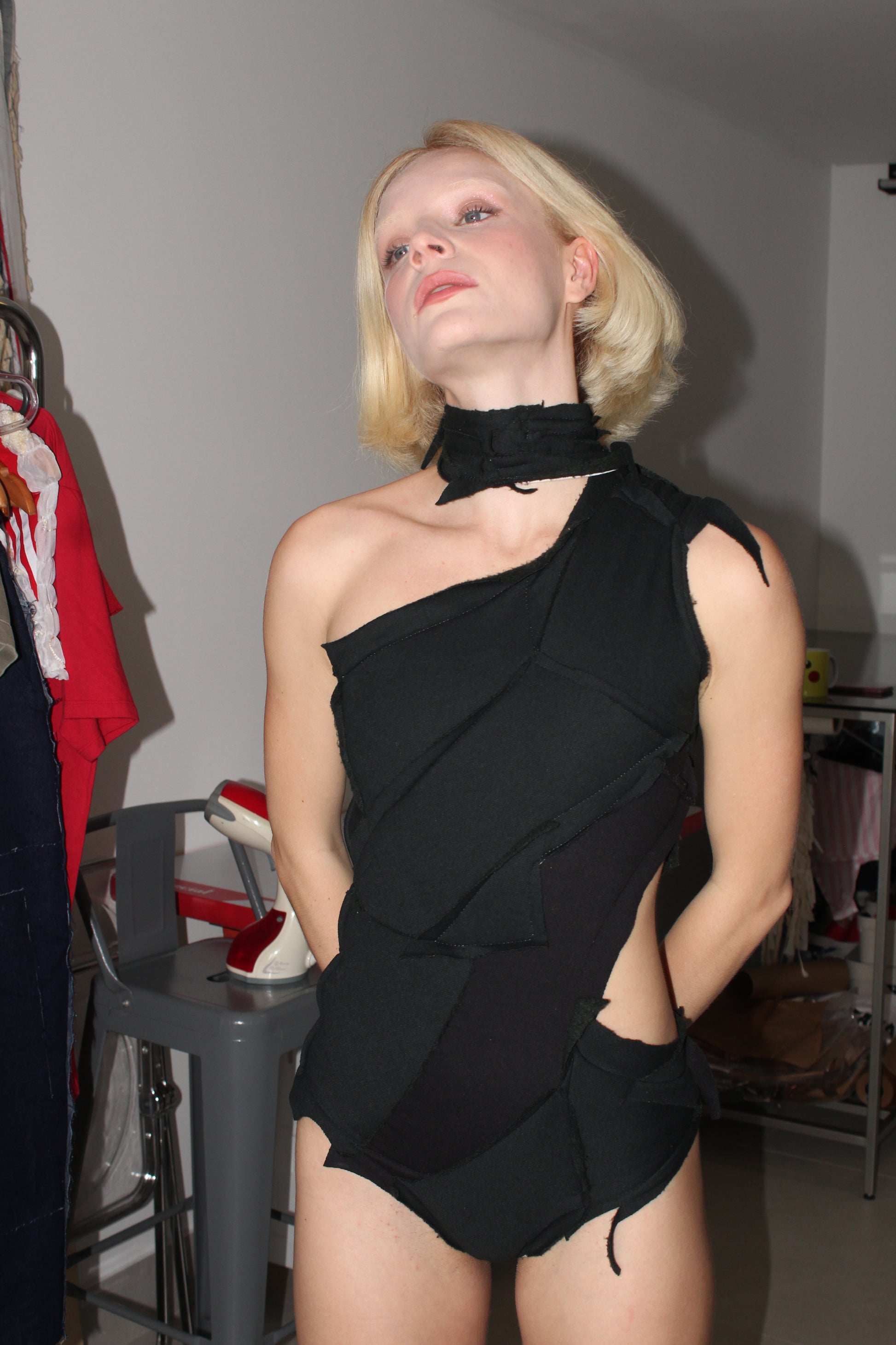 Essa peça é feita a partir de retalhos de moleto e crochê, tecidos de sobra da industria.
