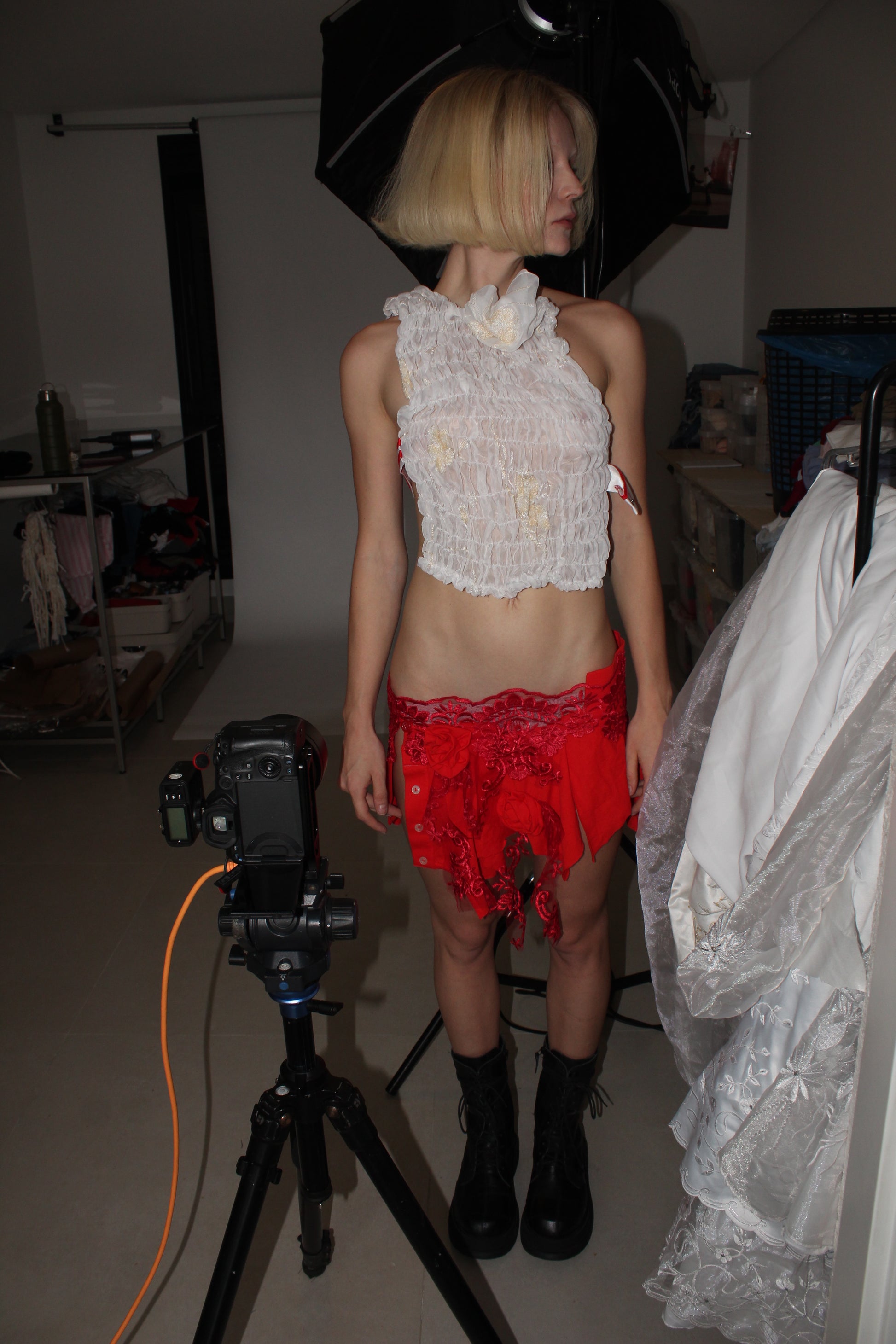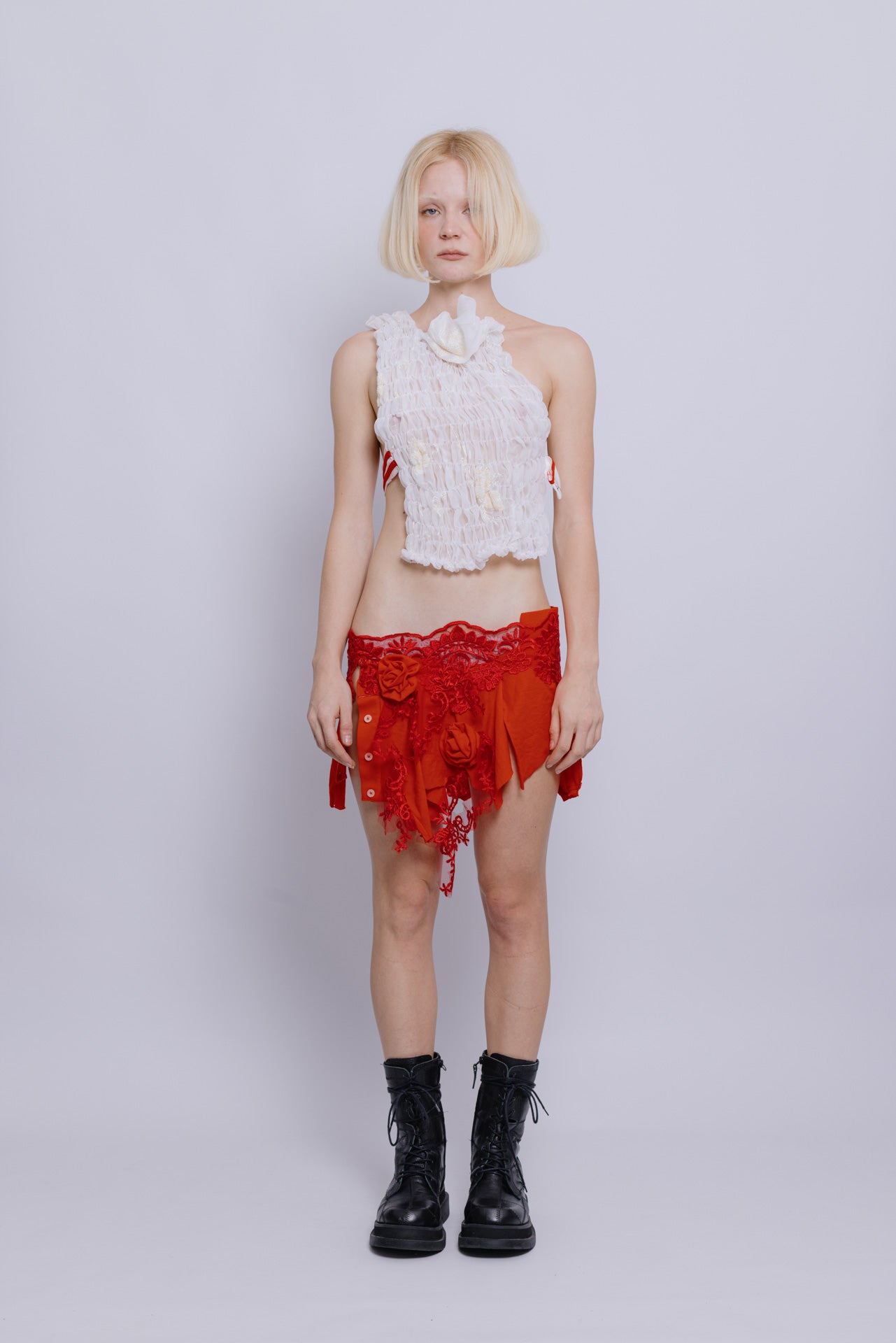 Essa peça é feita a partir de sobras de camisa polo e renda.